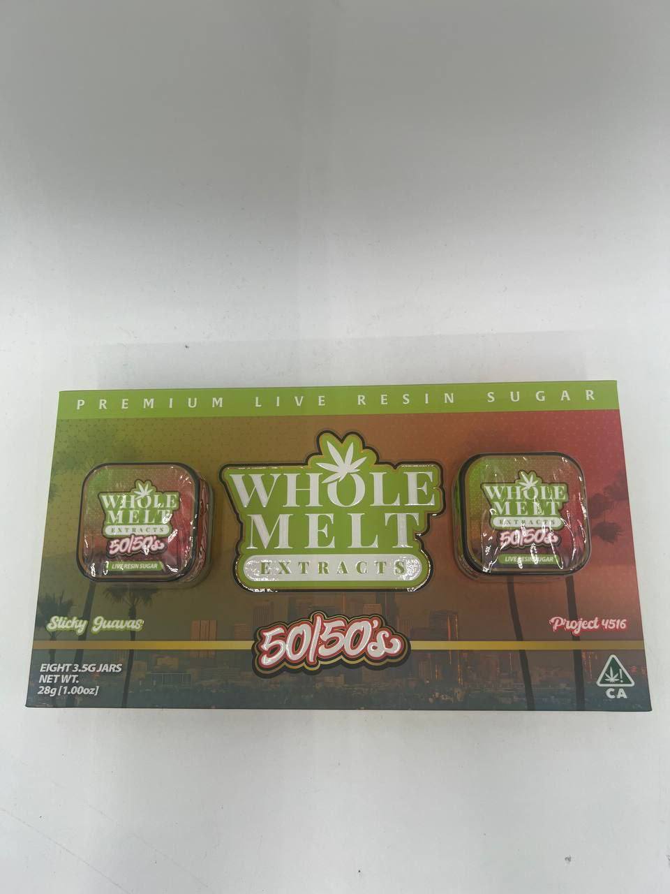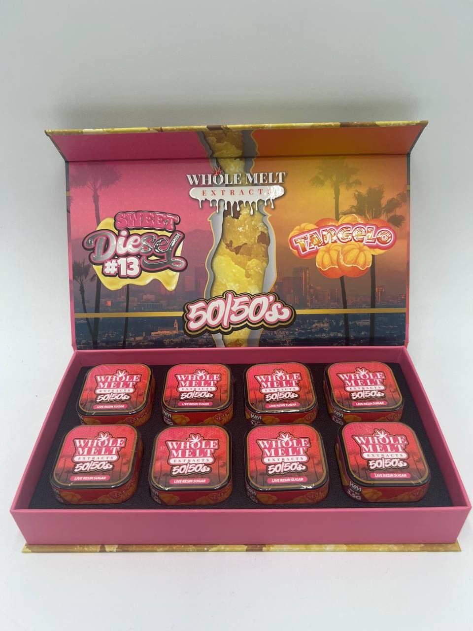 Elevate your cannabis experience with Whole Melt Extracts 50/50’s Live Resin Sugar, a perfectly balanced hybrid concentrate crafted for connoisseurs seeking potency and flavor. This premium product merges two distinct live resin strains in a single jar, delivering a harmonious blend of indica and sativa effects. Each 3.5-gram jar combines fruity, citrusy, and earthy notes for a rich, sensory experience that captivates from the first whiff to the final dab. Priced at $850 for a half-pound master box (8 mini boxes with 8 jars each), it’s ideal for both personal use and bulk buyers.